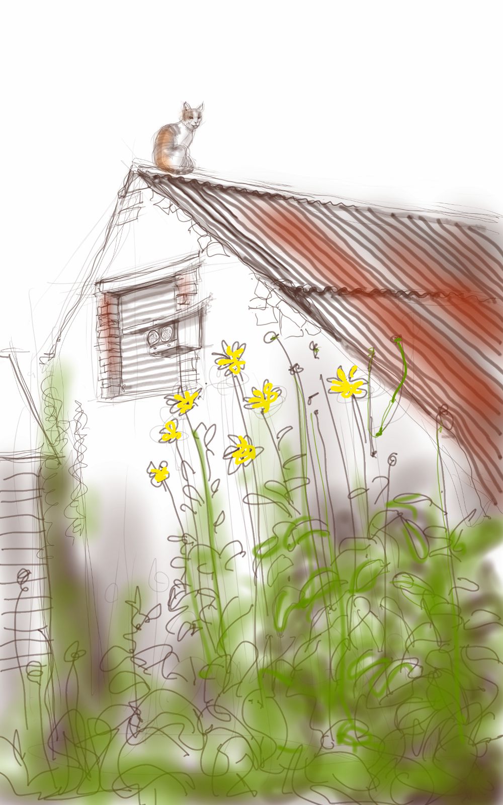 Percy has barely featured in Cat-of-the-Day lately. This is mostly because he has gone off his beanbag entirely, and taken to the sofa (which is not in my studio), and also because Arthur has been so amusing with boxes. I was so desperate for a sketch of Percy I snapped a quick shot of him as he sat on top of our garage (which is in fact an ancient crumbling stone barn with a rusty corrugated iron roof, quite artistic in its decay). I couldn’t draw all this outside – the surface of the phone is too shiny, and so I had to retreat indoors and draw from the photo.