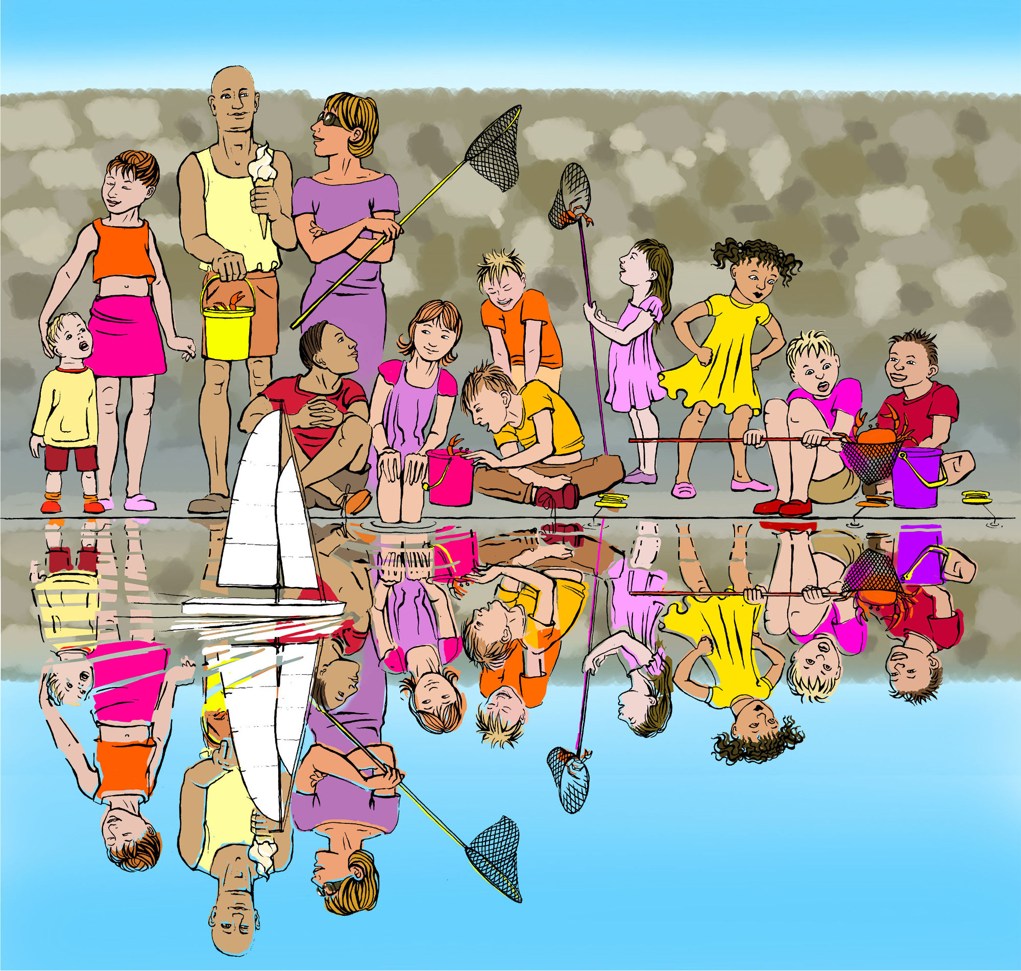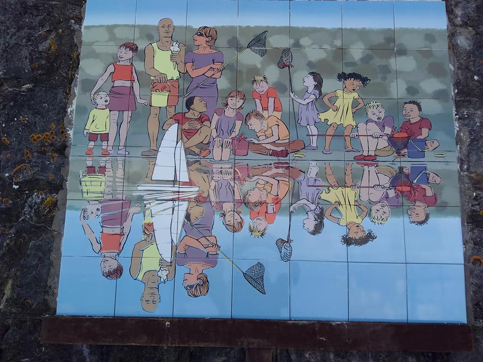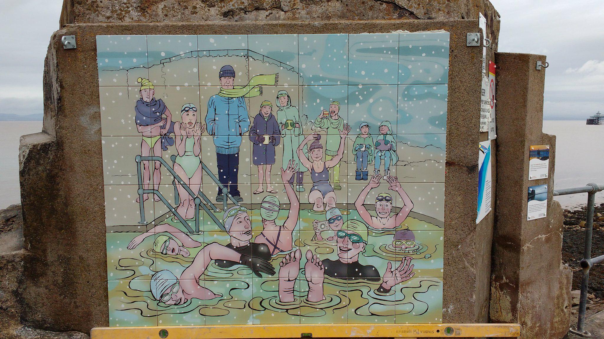 If you are interested in how these came to be, the original bid for lottery funding to restore the lake mentioned installing artwork, as part of the improvement of the lake, but it was no more specific than that I think. By the time Jo Tasker was lake warden I had started drawing a lot of the goings-on of swimmers at Clevedon, and other places where I went swimming and Jo asked very nicely would I like to create a picture that could go on the sea wall. My first idea was there should be 4 pictures, one for each season, but then it turned into 3 pictures, one for each activity. It made more sense, or there would just be swimmers in each picture!