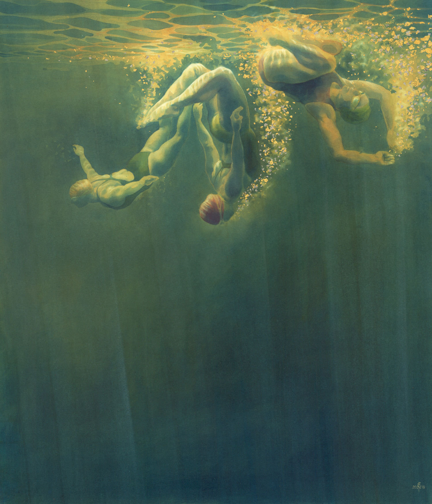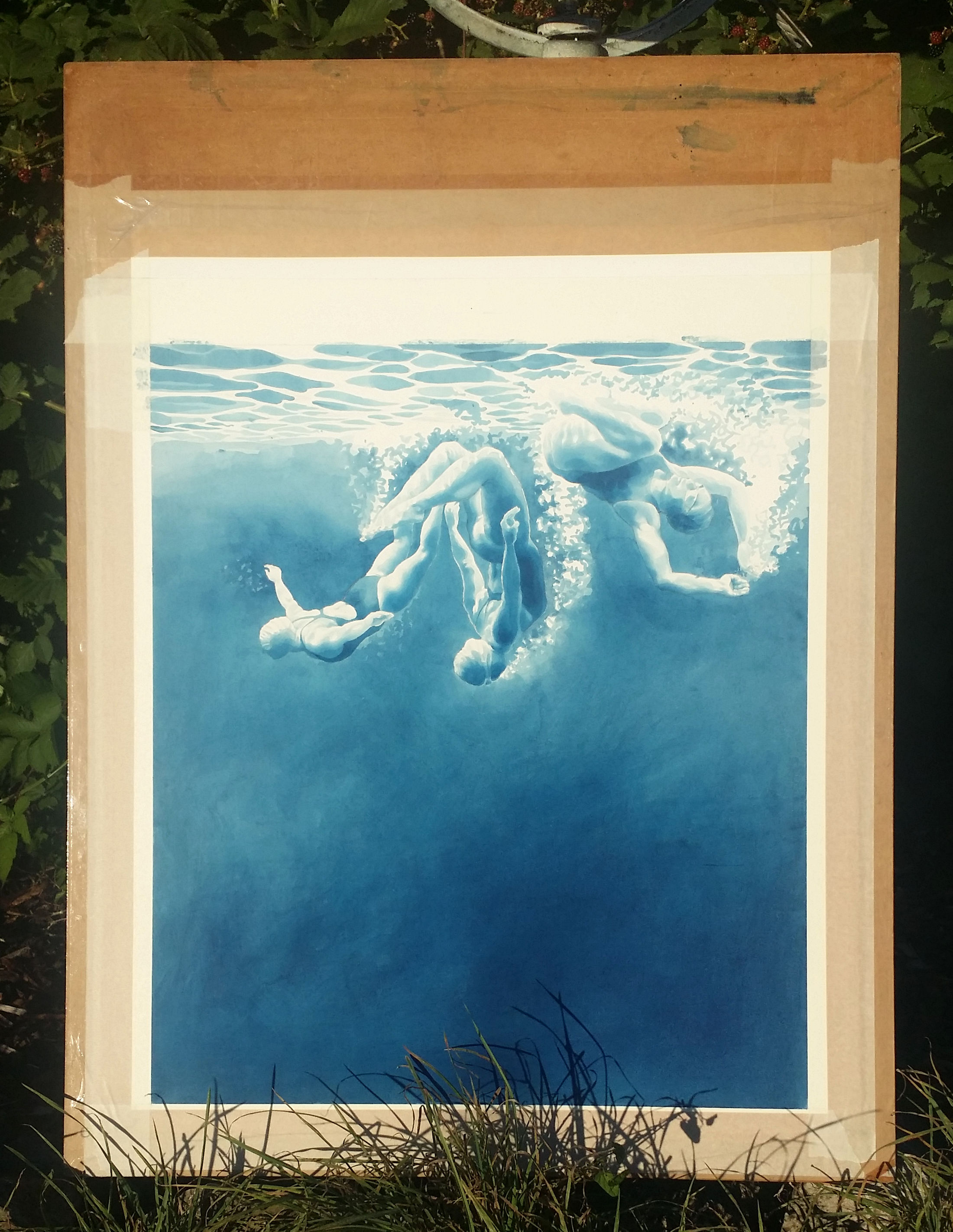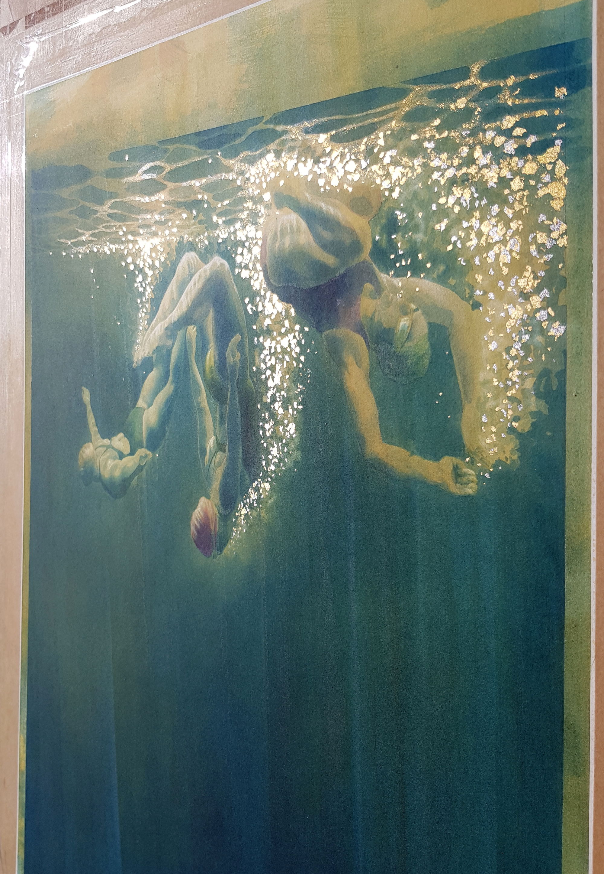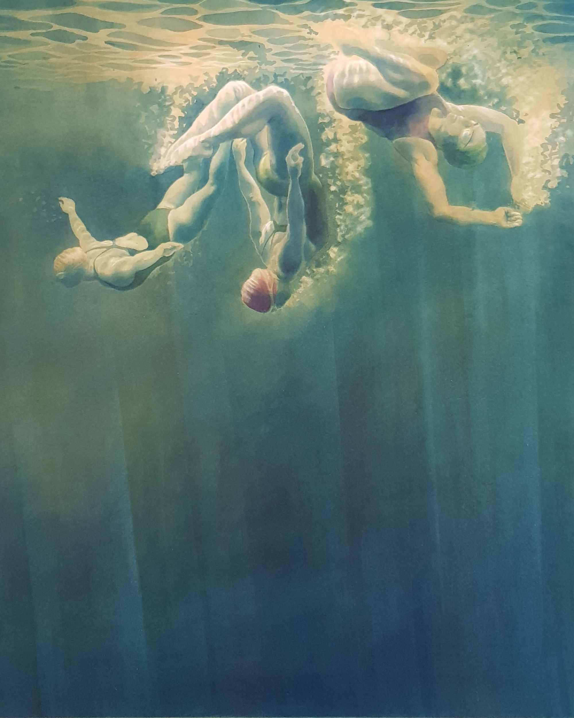This is Sally, Wendy and Cecily (left to right), who often swim on a Wednesday morning at Vobster. I particularly like swimming with them when I get a chance: there is much mucking about, diving, somersaulting, comedy renditions of synchro swimming. Occasionally there is swimming too. It’s all very good material for art: Sally takes fabulous photos, I take snaps by the simple method of pointing the camera in the general direction of the subject while repeatedly pressing the shutter for as long as I can hold my breath, but they are exactly what I need for paintings afterwards.