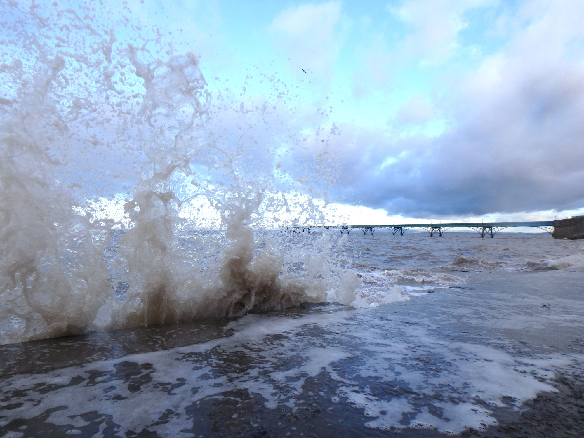 So it was in a slightly surreal and thoughtful mood that I stood taking photographs on the sea front. There were indeed (modest) white horses, there was also a spring tide and much splooshing of water up onto the walkway below the sea wall. And I was the only one there. I even wondered, if I continued to be the only one there, would I go in anyway?