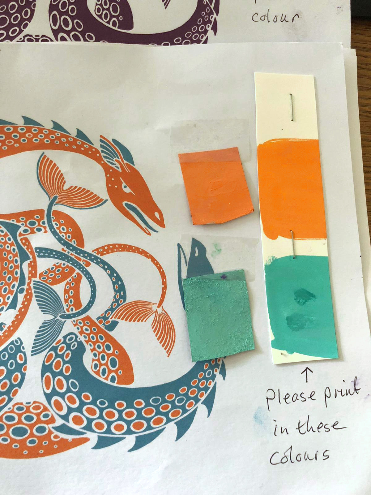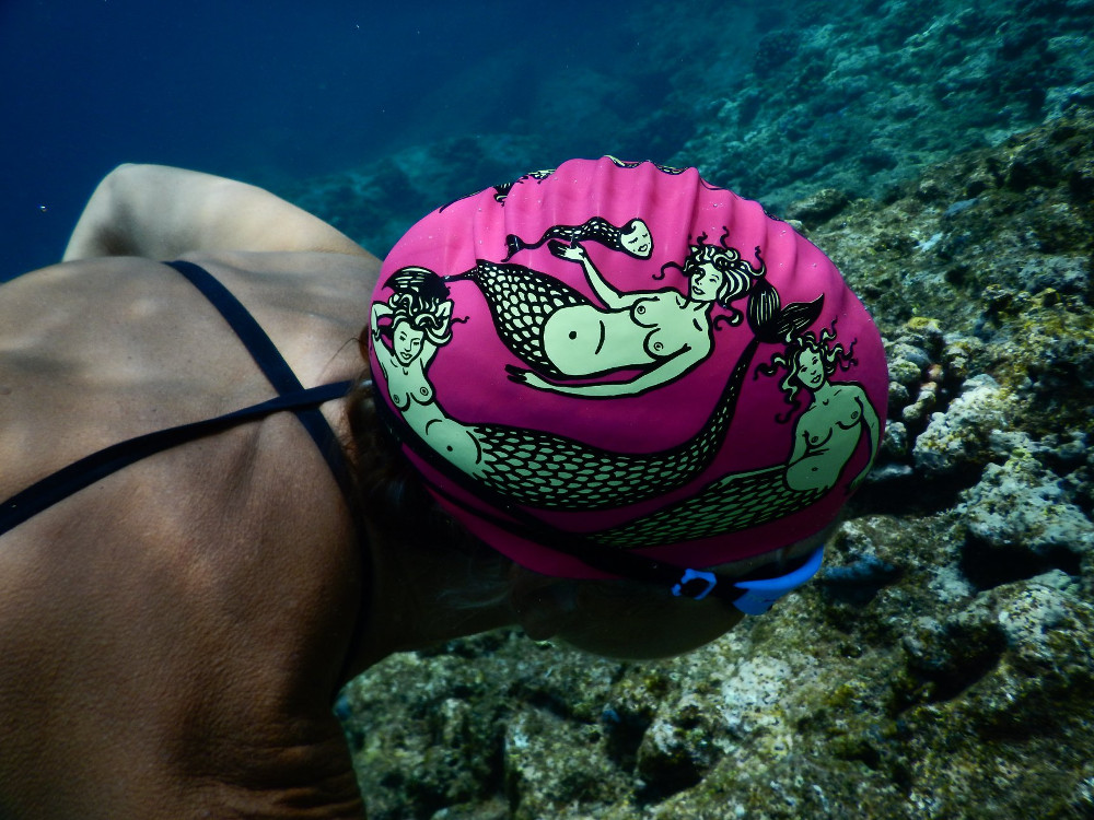 If that’s all you were looking for, read no further, follow the links! The rest is mostly pretty pictures. I am very pleased with this new one – one of my two-colour Sea Monsters hats – a twist on last year. I can be very particular about colours, as you might expect from an artist, and I wanted a really nicely balanced colour combination. I mixed an orange and turquoise from my watercolour paints, put them in the post and sent them to the lovely hat-printing people Swimhatco.com, who carefully matched my samples. Turquoise in particular does not print true from a computer screen, so this was the only way to do it. I was delighted that they got them just like my samples.