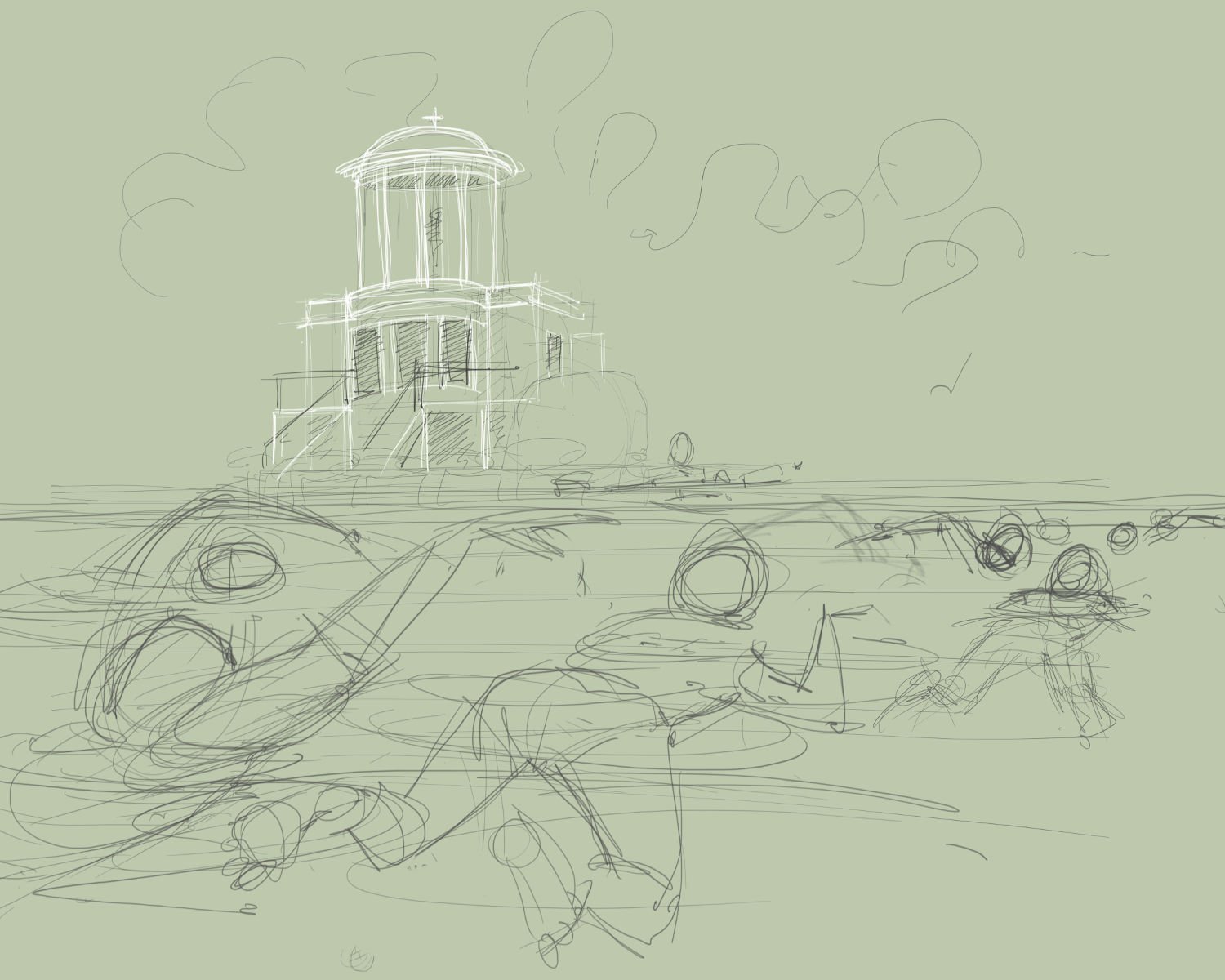 This is a rare drawing for me – a swimming drawing about a swim that I didn’t do. But I was actually there all the same. For three years in a row now, I’ve had an artwork stand at this marvellous festival of swimming, so it seemed about time I recreated it as a piece of art. The landmark is of course the temple on Temple Island, silently witnessing the events of the day, as it has done for close on 250 years.