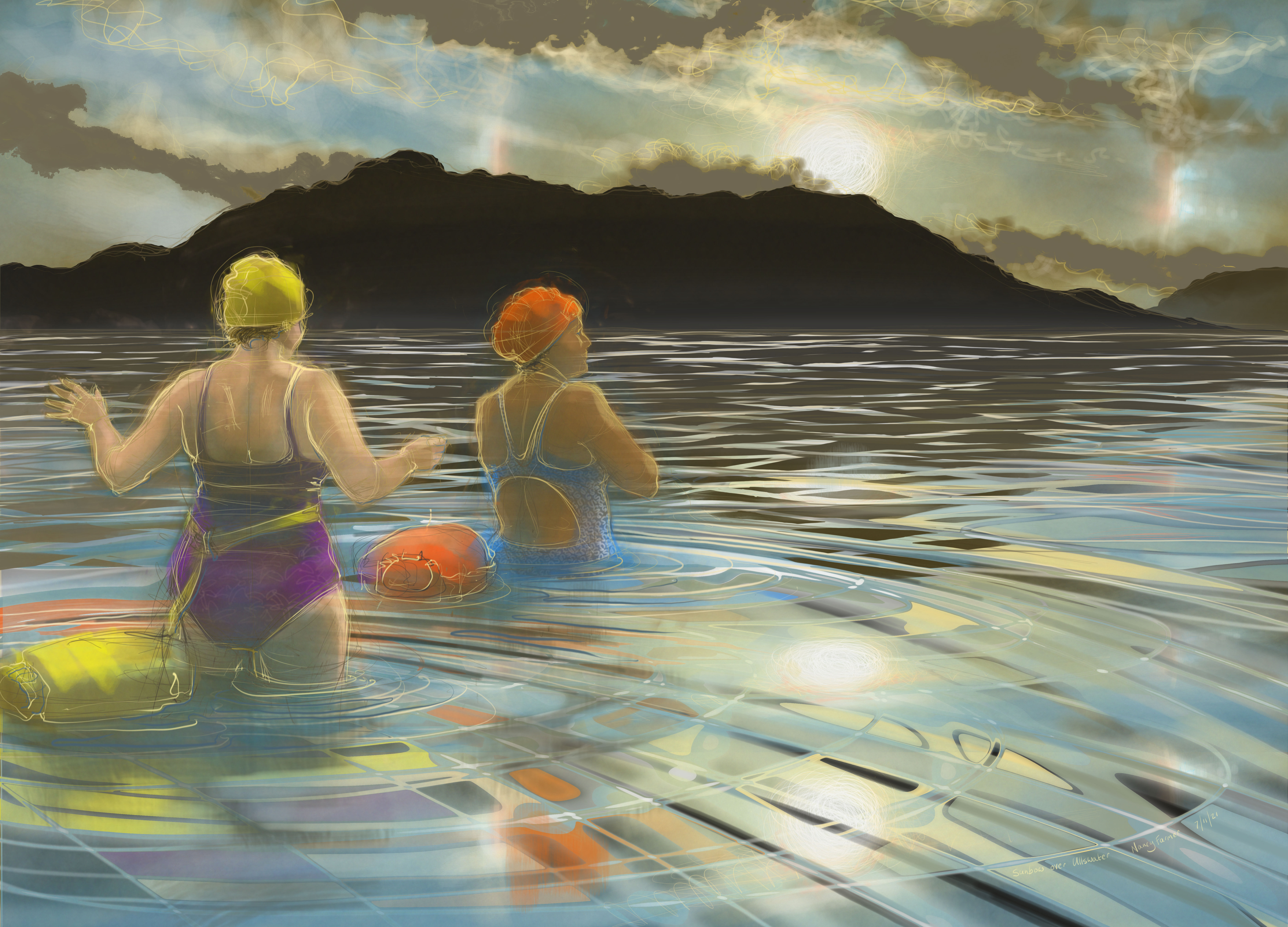 Of course it had dissipated before I arrived at Glencoyne bay a mere five minutes later. And it had long since gone by the time Francine, Susan and I had discussed the year, the water, the weather, swans, Susan’s complex movements of stage scenery and kilns, paddle boarders and other important matters. And had actually entered the water. But it had been there, just there, barely an hour earlier…