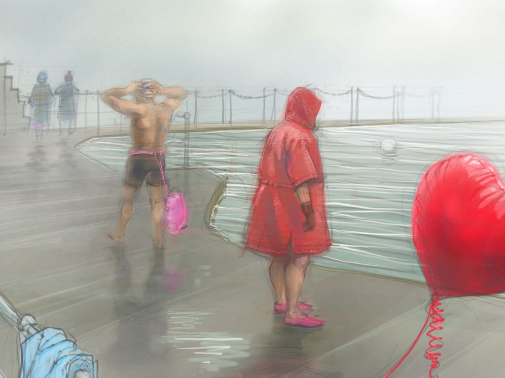 Dave wasn’t there, but I remember him from days like this three years ago. He was one of Row’s original Winter Warriors, into whom she infused a love of winter swimming through a combination of wisdom, reassurance and comic capering. On a grey day, Monday’s Winter Warriors were distinctive in their red changing robes: almost a uniform but entirely by chance.