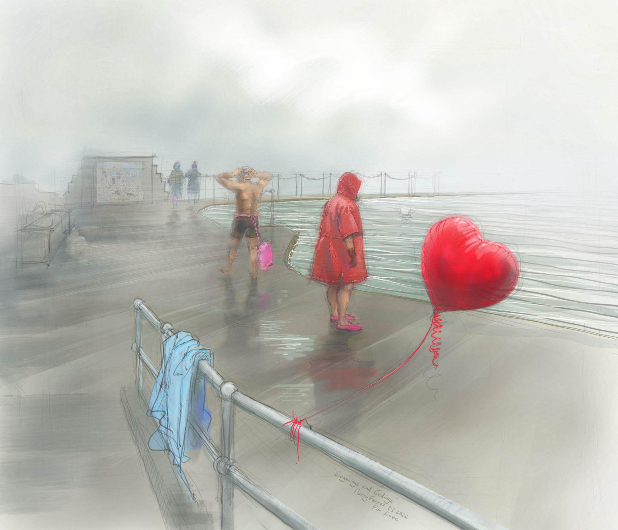 But Dave cannot join us for any chilly Monday Mornings now. He died, so sadly and with heartbreaking timing, on Christmas day. I heard the news as I was contemplating the beginning of this drawing, already a scene of uncertainties and memories, endings and a new dawn. I think he would have been happy to be remembered in this picture.