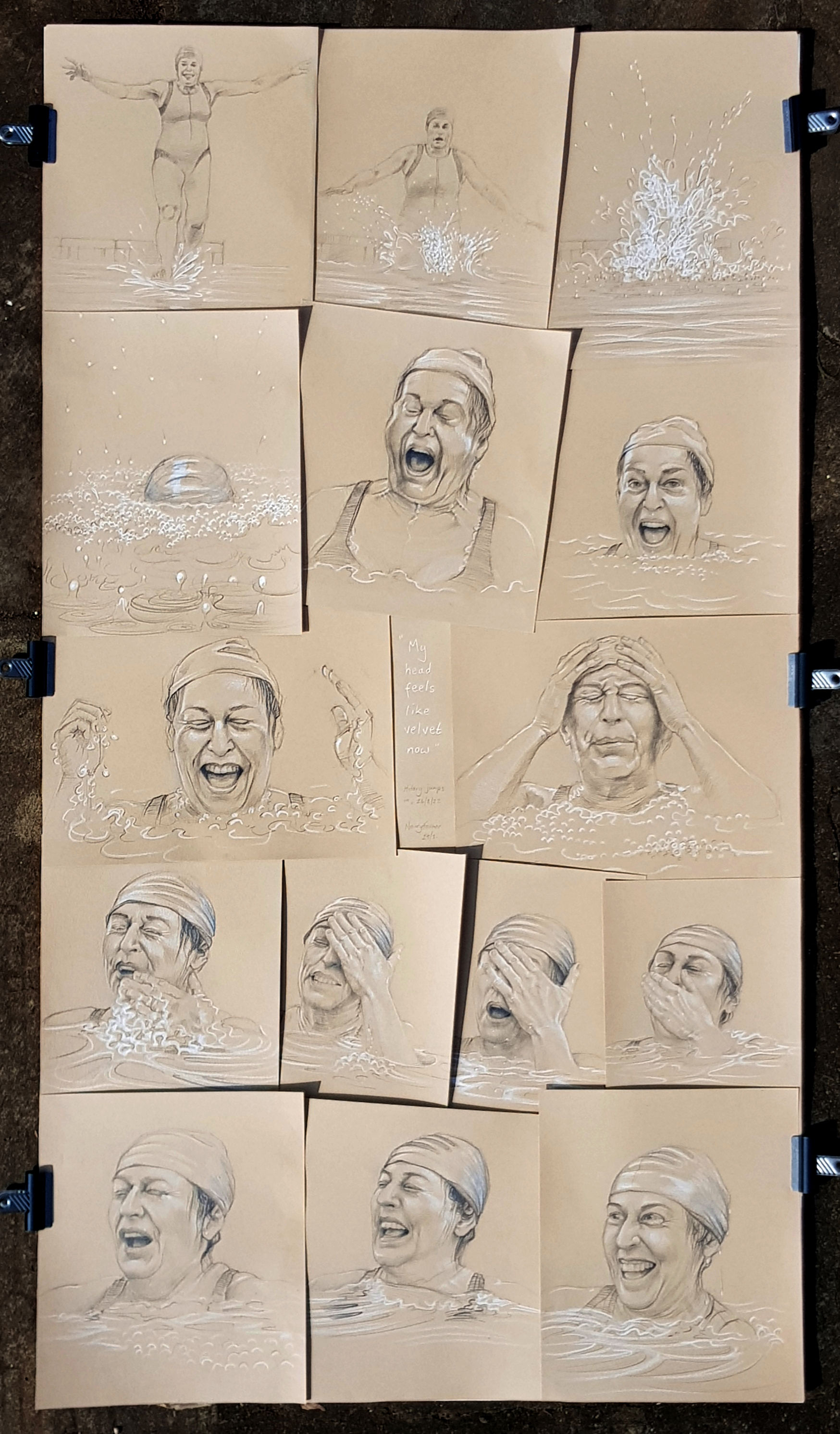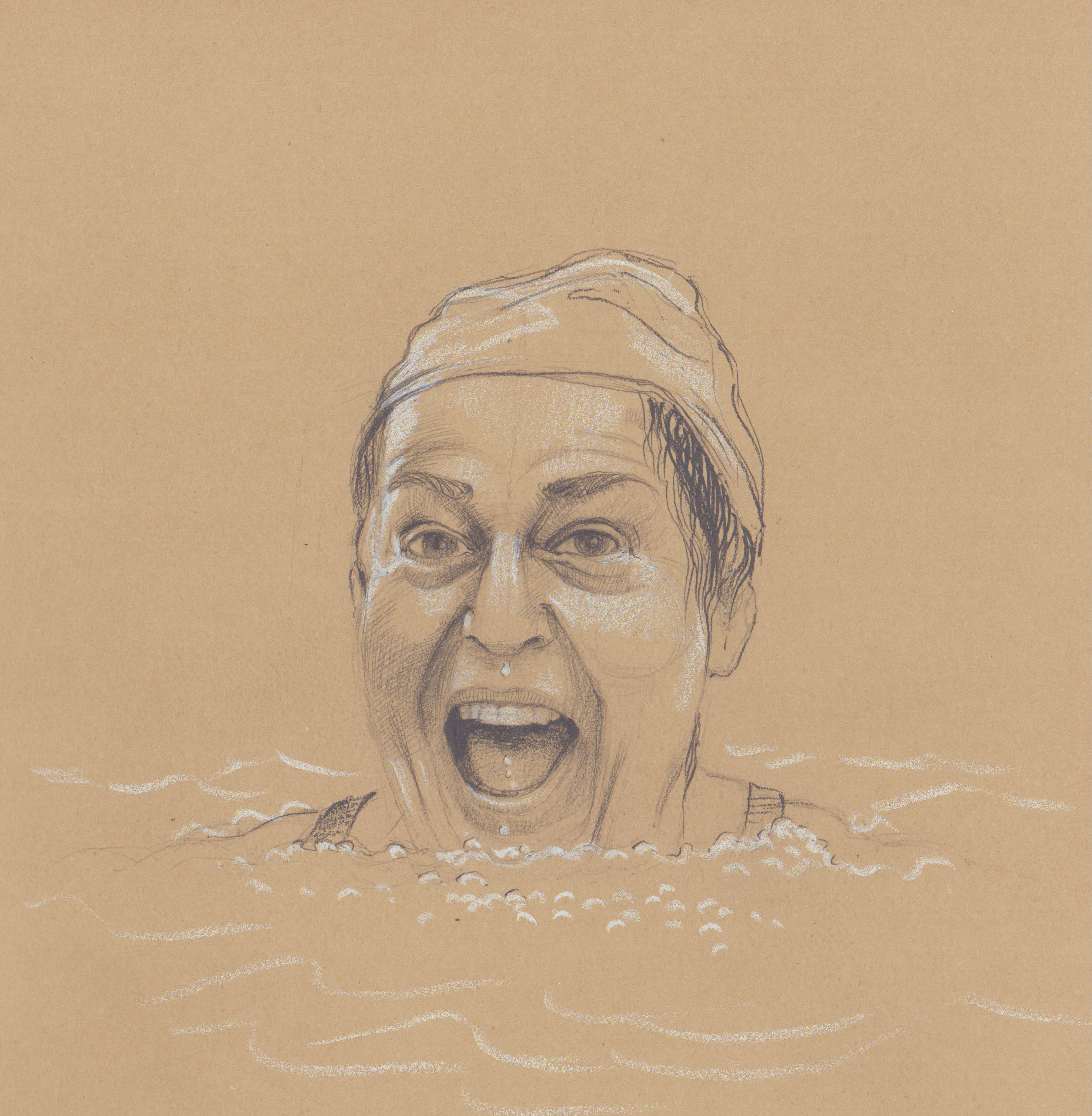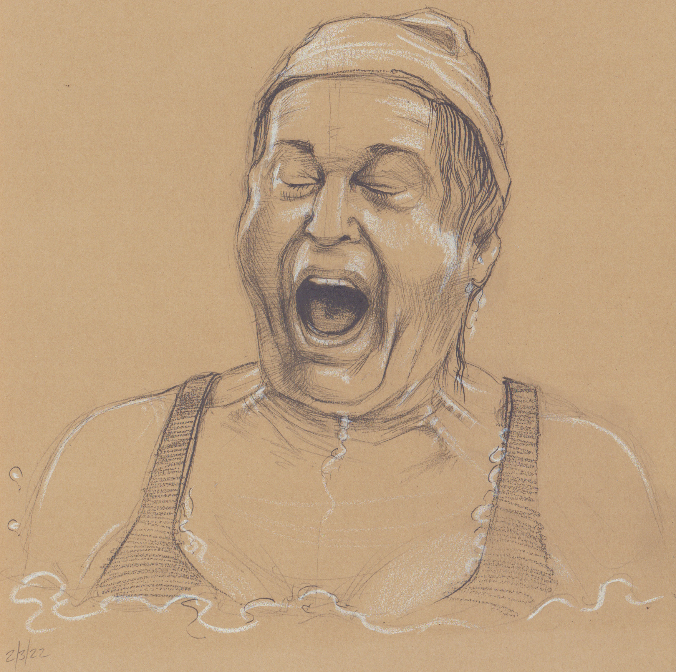 There was some discussion on Facebook this morning about Wim Hof getting a load of celebrities jumping into cold water on TV and whether this was a good idea. I haven’t seen it, I just thought you’d like to see how a pro jumps into cold water. This is Hilary Jenkins-Spangler who was fantasticality accommodating enough to suggest jumping off the island in Clevedon Marine Lake last month… just because I wanted to practice drawing portraits*.