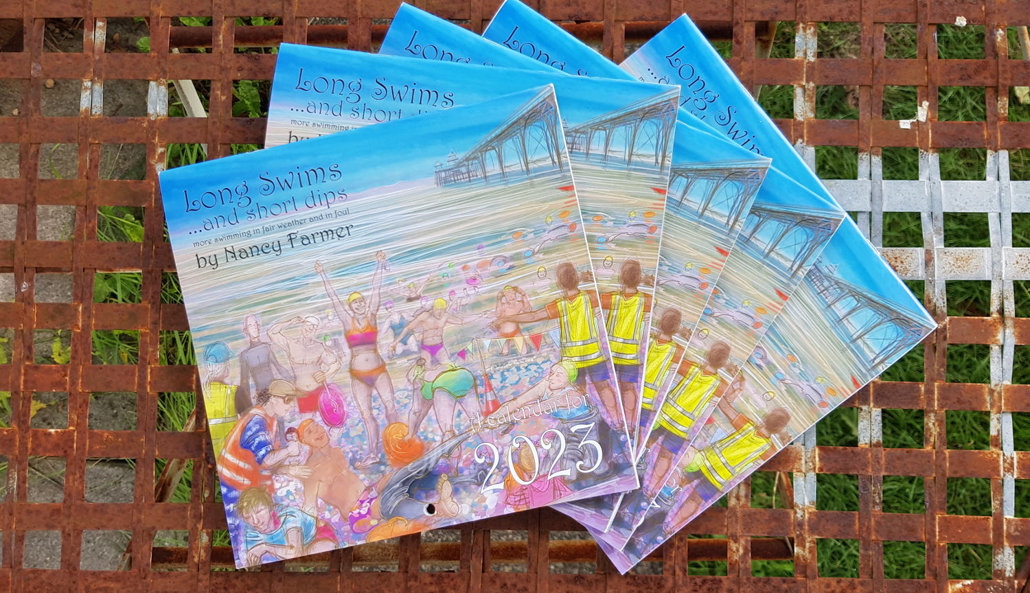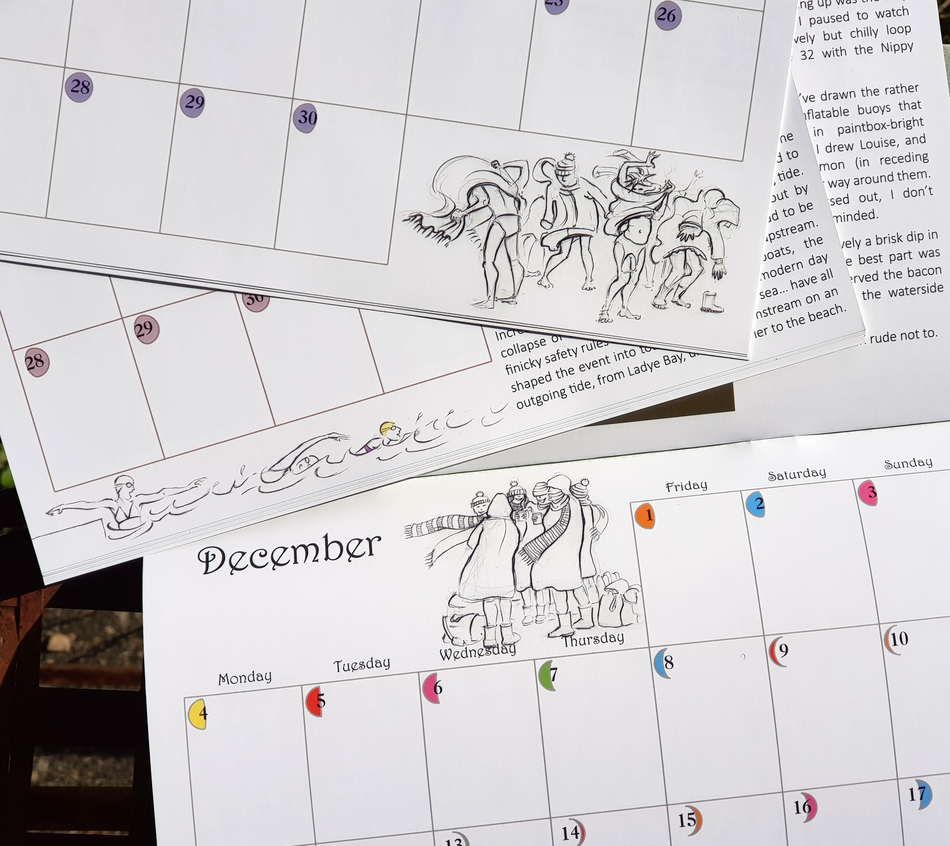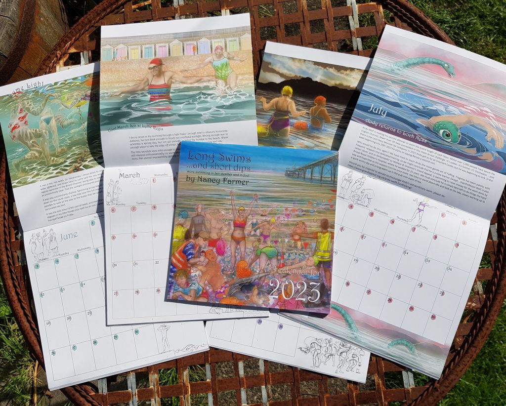It was a labour of love this one – they all are, but I seem to put more into each one as the years go by. This time, it features not only a picture for each month, but I have added extra little drawings for each page. It came about because one of my best swimming friends wasn’t to be found in any of the drawings I’d done (not my fault, she is spending a lot of time absent, doing a degree), so I added a little narrative all about our Monday Faffers group, especially including Lucy in her distinctive purple bikini.