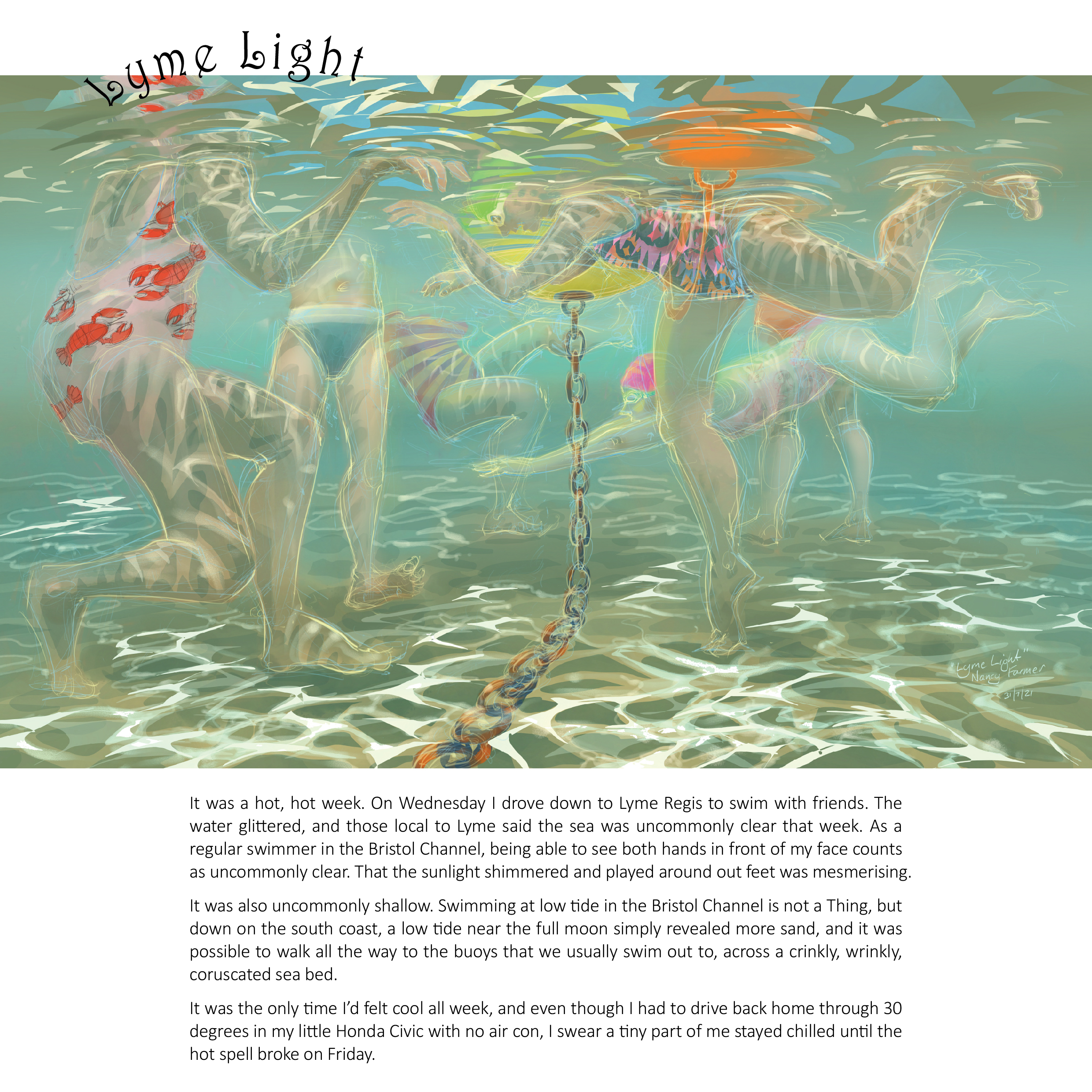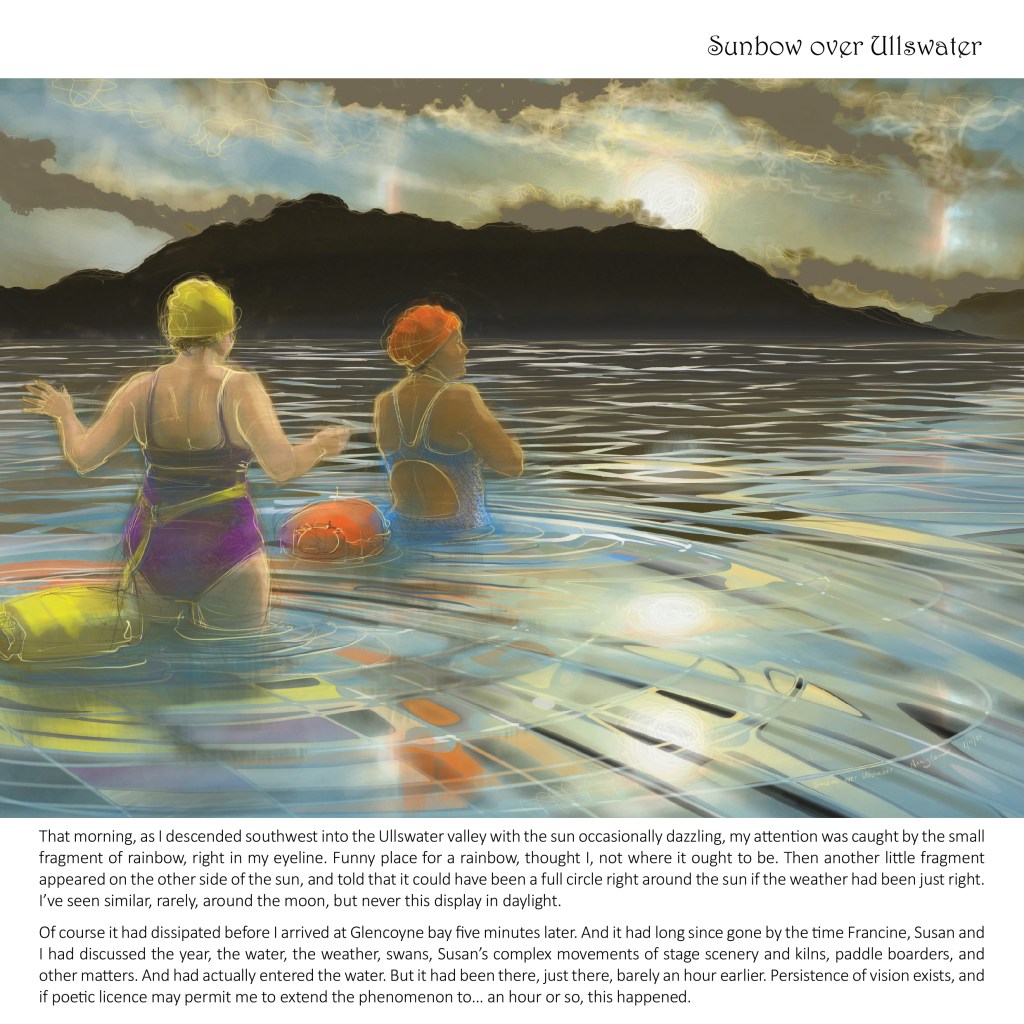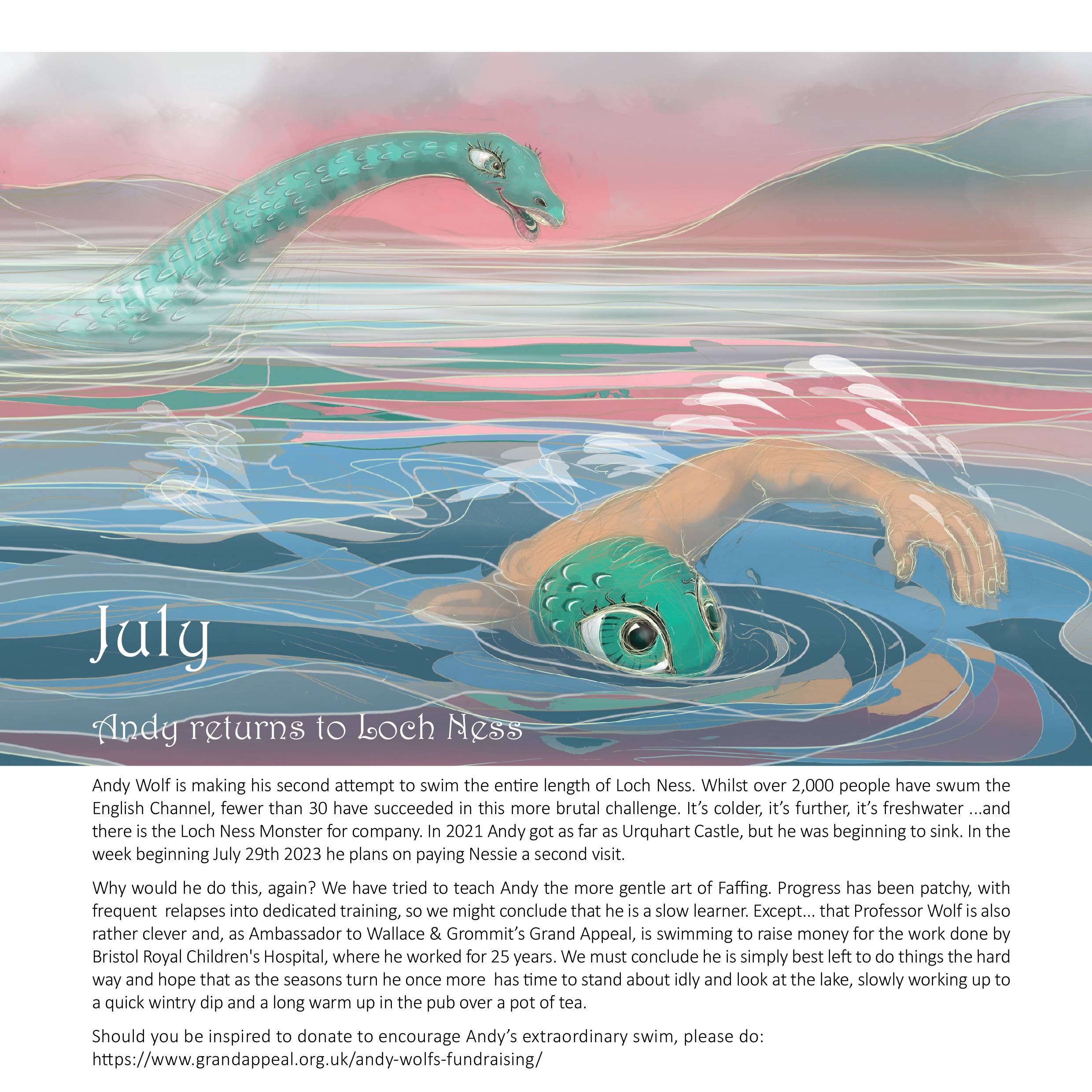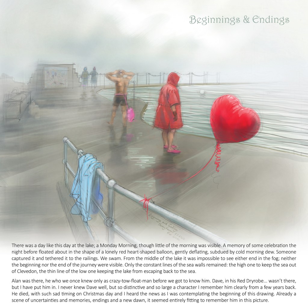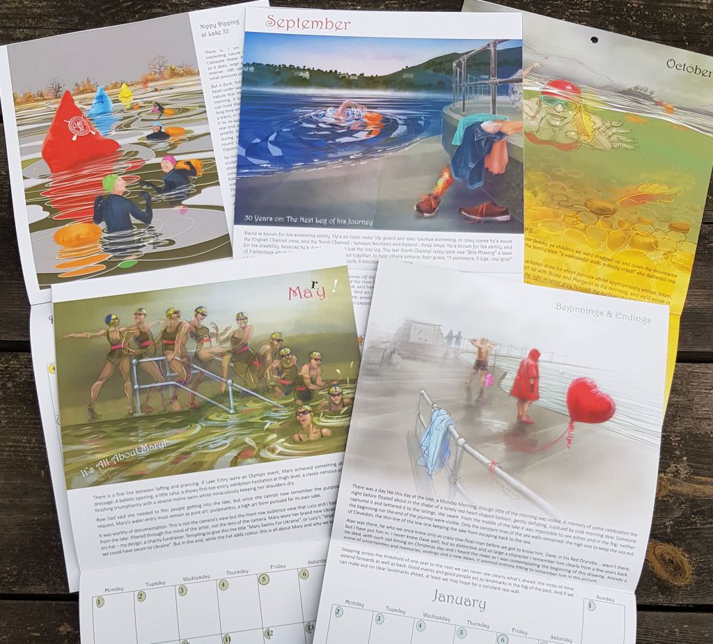 The calendar gets its name from the image on the front cover, a drawing I did of Clevedon Long Swim, an event which has run since 1928. Short dips… need no explaining: we swim all year round, it gets a little nippy. In addition to Clevedon, the Lake District, Lyme Regis, Loch Ness all feature and also Camlough Lake in Northern Ireland, in a very special picture of David Burke, which will get its own post quite soon….