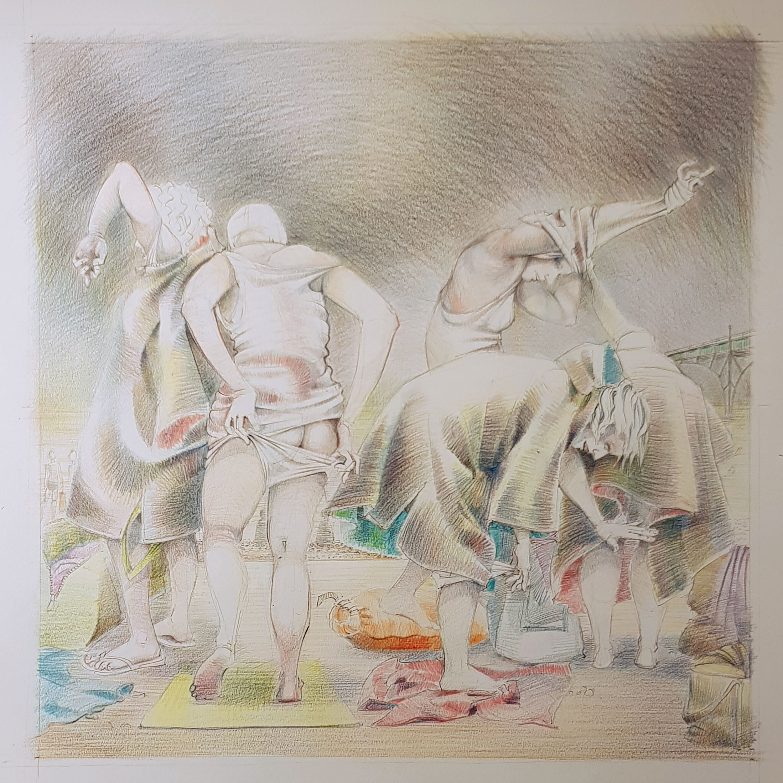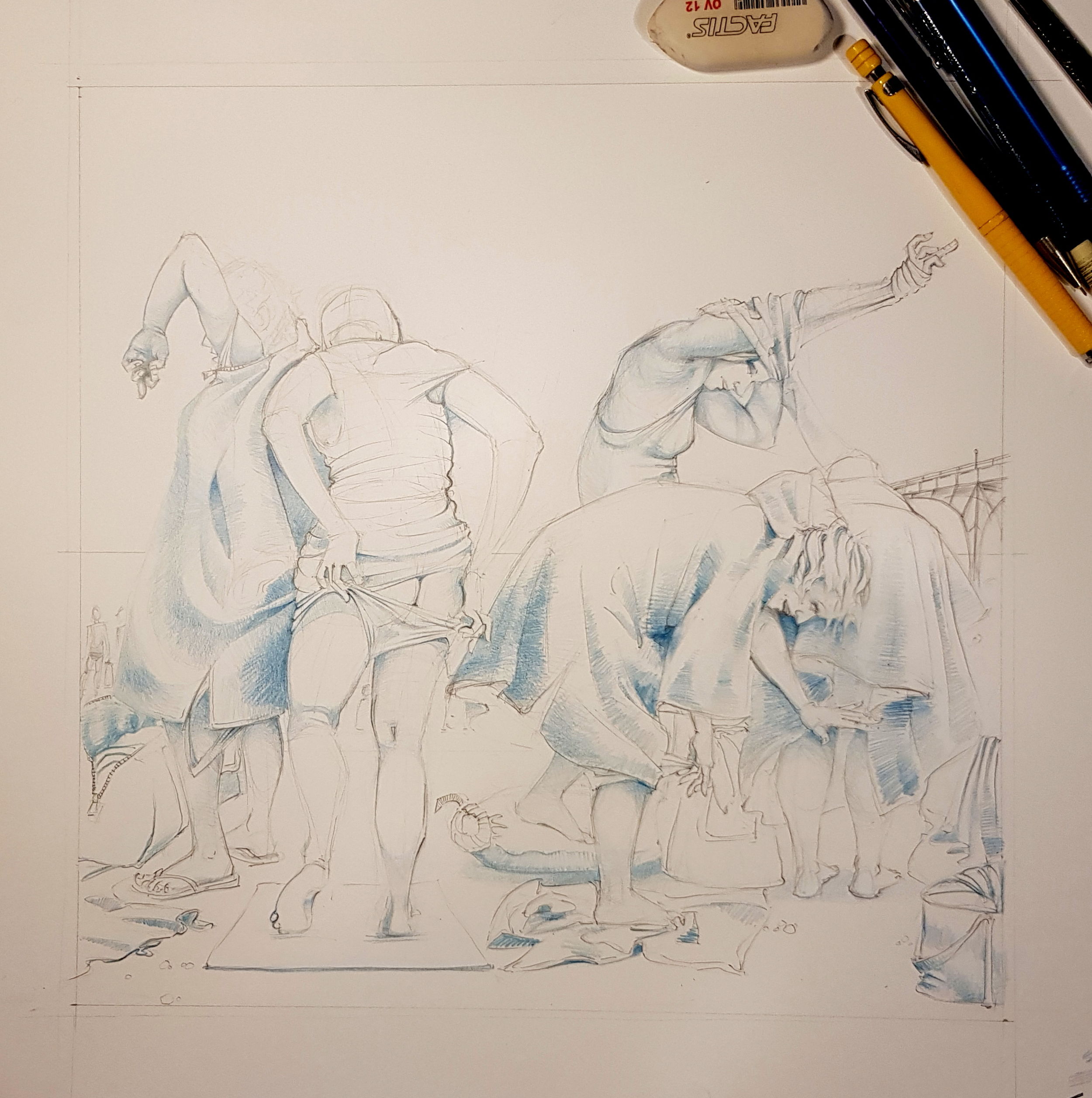 After spending so long almost exclusively doing digital drawings, I was pining for the real substance of things – a visceral ‘thingness’ that gives the line and the colour much more character. So this is the first drawing I have done on real paper for a while and only the second in coloured pencil for years. I hope you like it, because colouored pencils are my new (old) favourite thing. I took some photos as I went along. Apologies for the changes in lighting, there’s not been a lot of decent daylight for photography lately, but still, you might find this sequence interesting:
