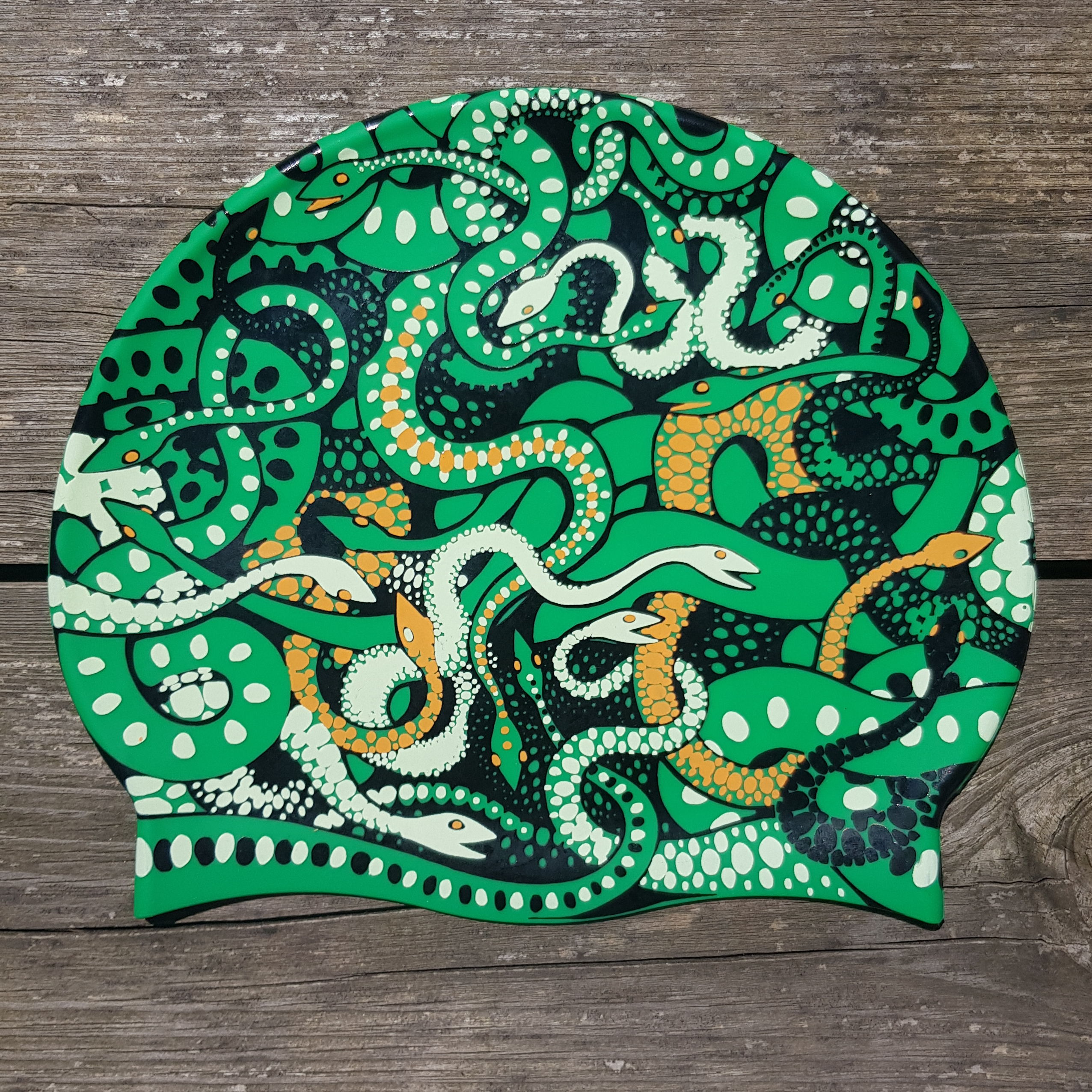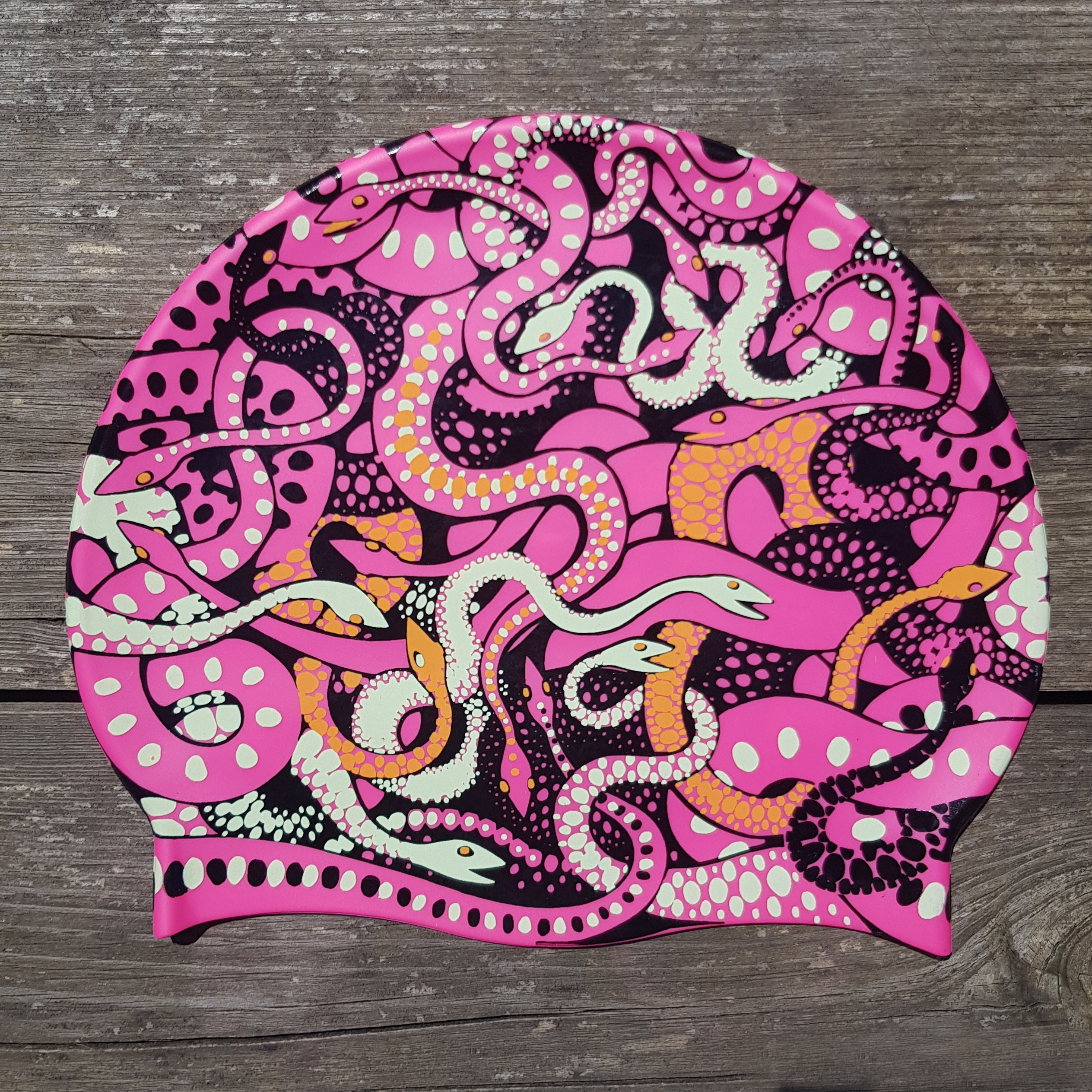 For the rest of the rendering of this image I did take it onto a tablet and fill in the colour and patterns on the snake that way… and endlessly adjusted it and added to the design till it became what you see now. It was then expertly printed by Swimhatco.com and is available in my shop – while stocks last. I’m onto my second print run at time of writing (October 2025). I cannot promise there will be a third print run, it’s quite an investment to get these printed, but there may be. You can always email me if you’d like to find out more.