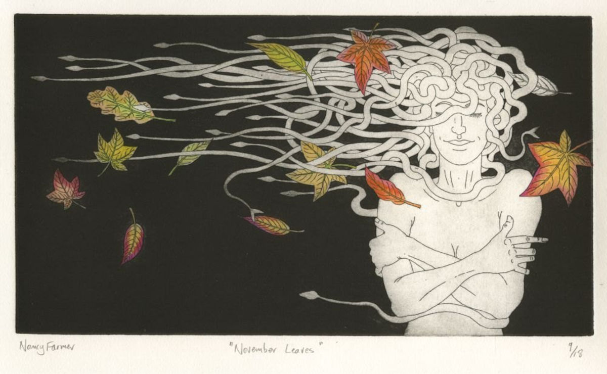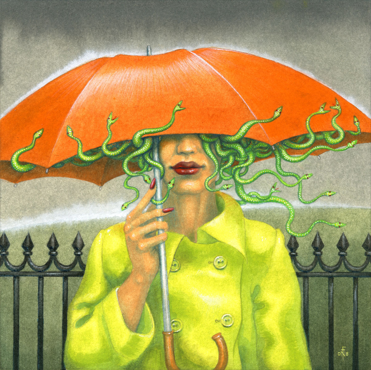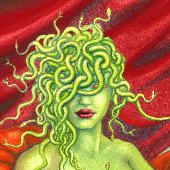 Below are just a few of my past “portraits” of Medusa. If you are interested in these, I I have prints for sale in my Other Etsy Shop https://www.etsy.com/shop/nancyfarmer – this has a collection of my older work. You’ll find Medusa here, and also fairies, angels, demons… no swimmers at all, except for a few mermaids.