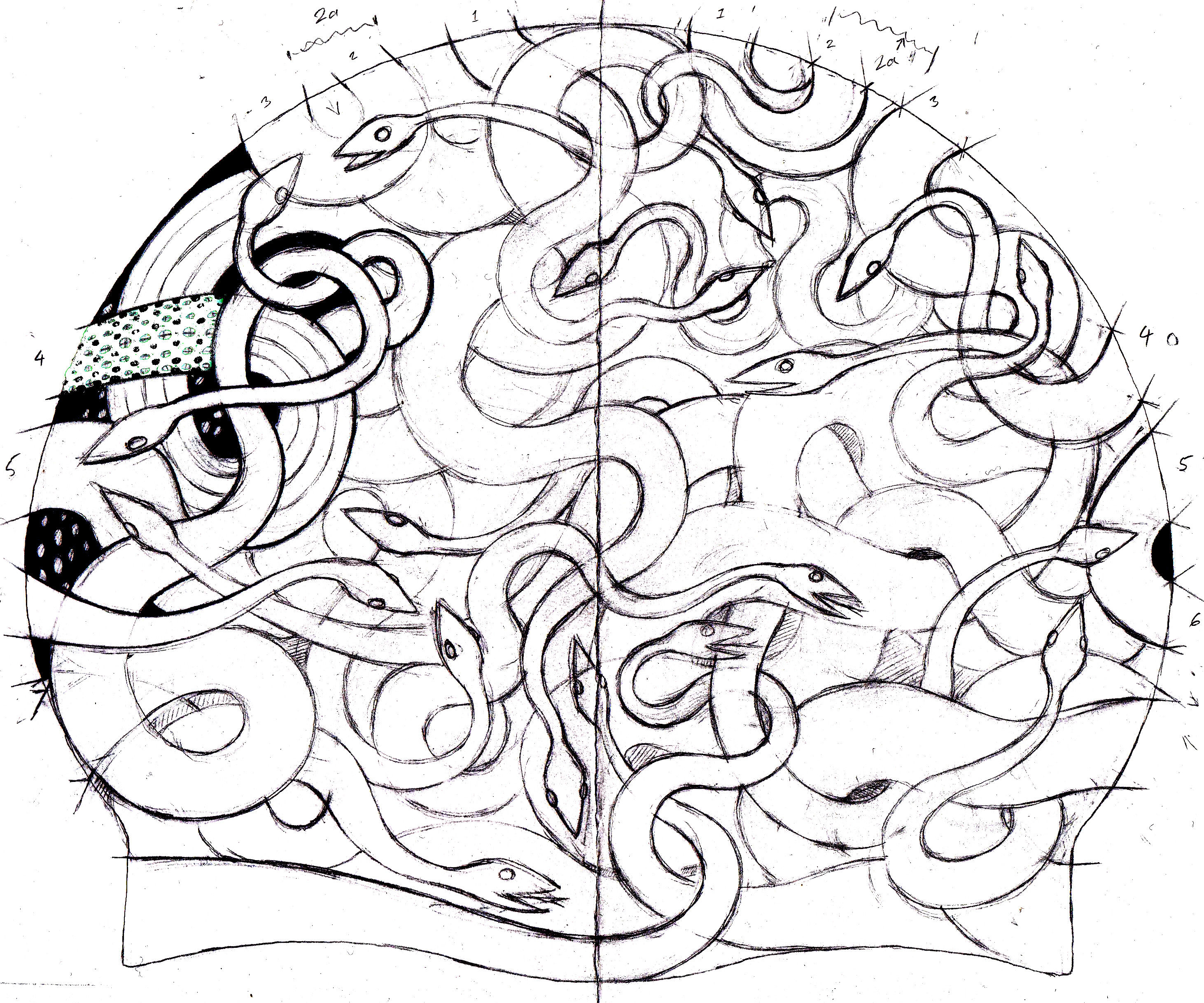 It may not look much but hours of work went into this sketch. Each snake crossing the edge had to be matched on the other side, so that when you see the hat finished, the snakes travel across the centre line of the hat and back again. The joins and the angles are not perhaps perfect, but for a hand-drawn image, hand-printed onto a silicone swimming hat, I think they are good, and they certainly have the desired effect when worn.