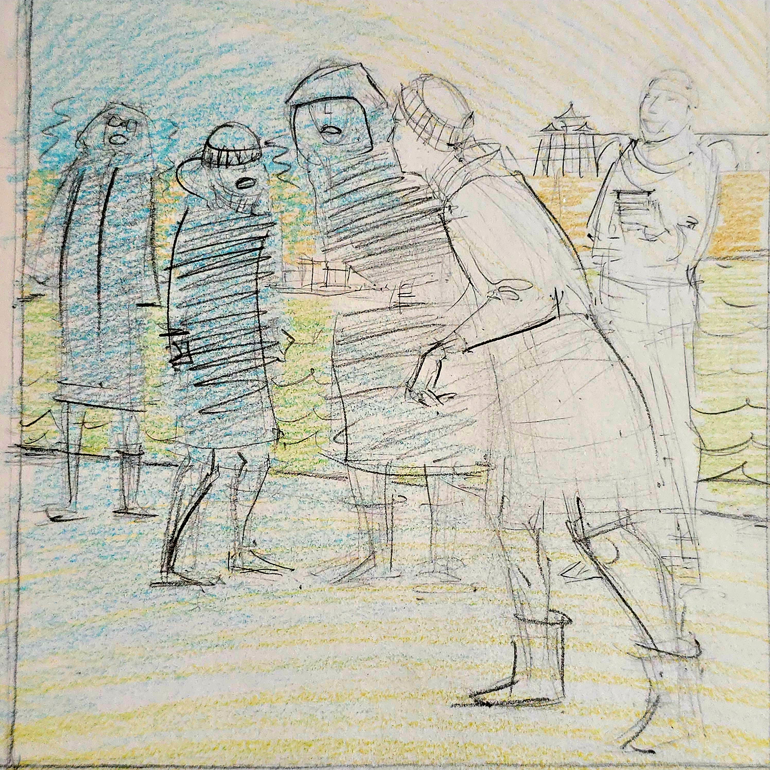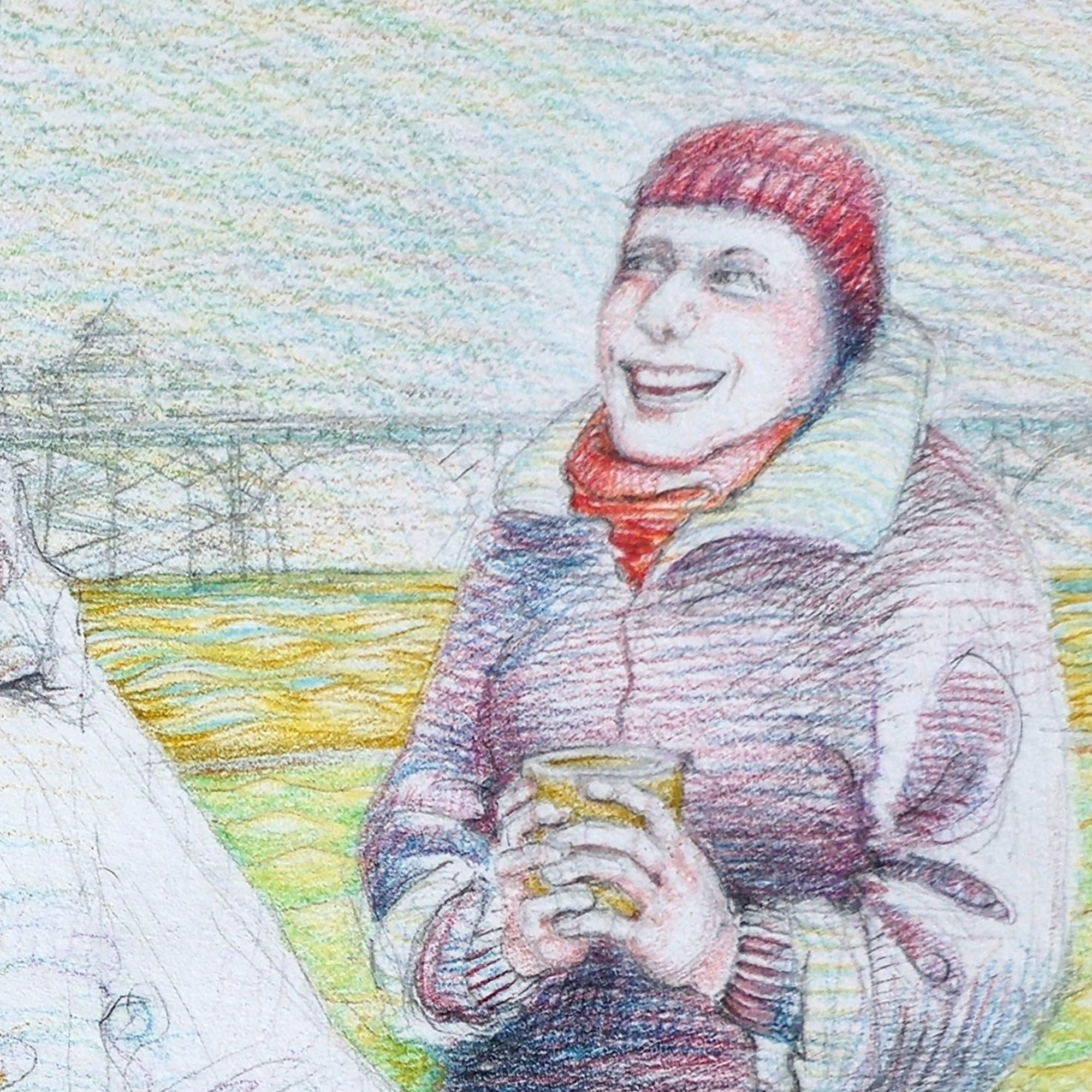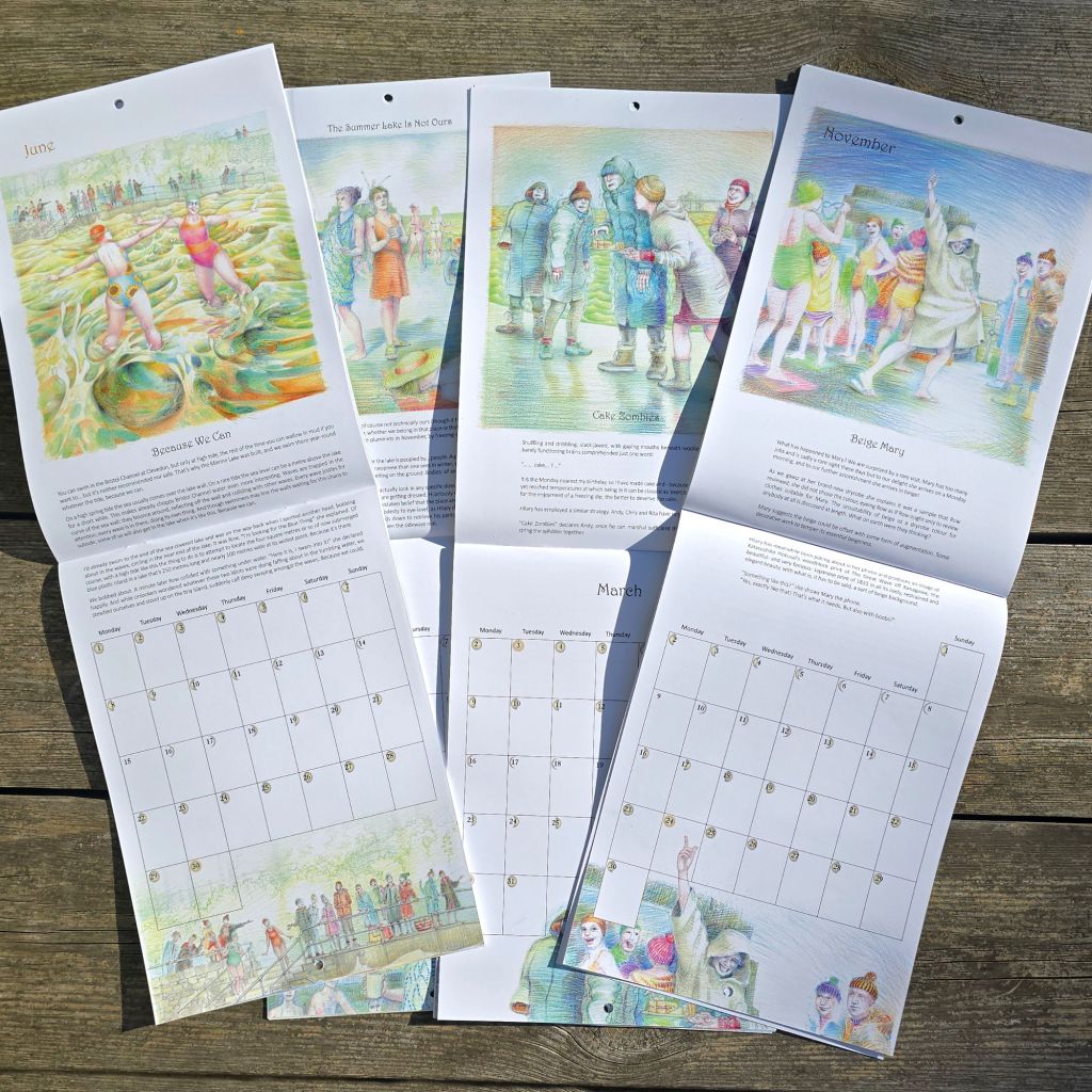 I admit, this is one of my favourite drawings from this year’s calendar collection. This is where pencil is a delight to work with, in that fine line between drawing solid objects and describing physical movement I think there would be a lot of territory to explore. If only my friends will continue to turn up and wobble about in this state and if only I can find the time to get some artwork done I would like to explore more of it. Fortunateley one of those conditions will exist for a few months now for sure. So that’s something….