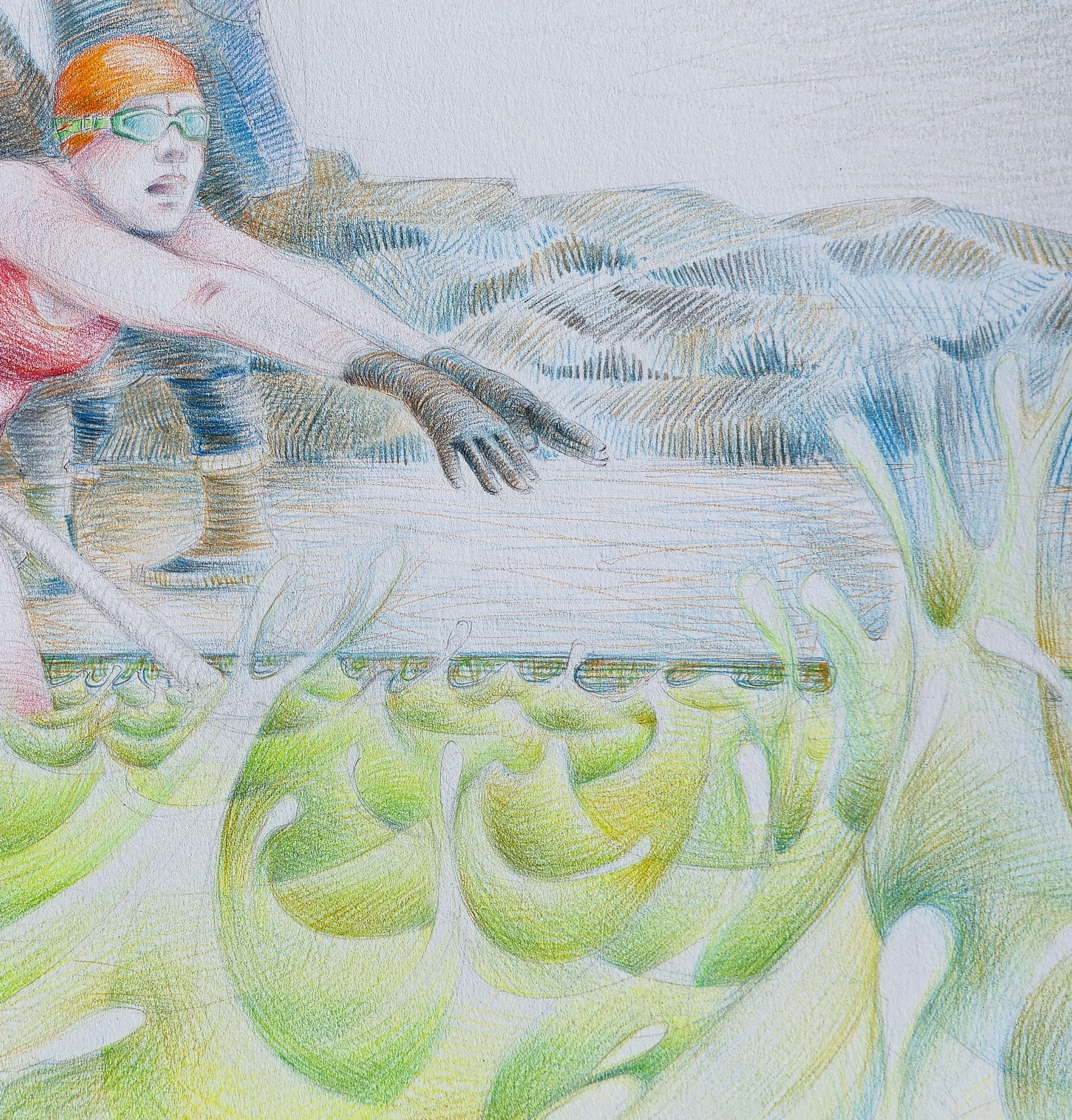 The enthusiasm of a silly undertaking gets in with us, reluctance never catches up: we left it on the shore. Aware, for all that, of the danger of striking out for the far end of the lake just because Andy and Chris did not, I swim determinedly to the middle buoy, just as far as they had gone. And fail to stop. There is another buoy about the three quarters mark. Reaching that, I somehow don’t manage to turn round there either.