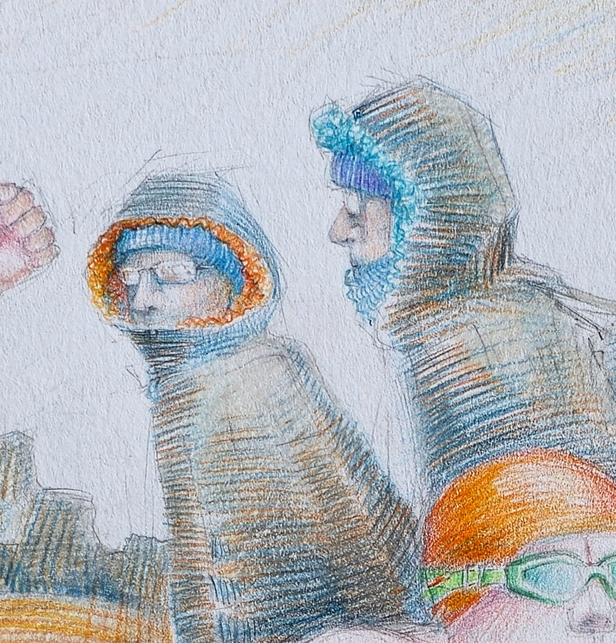 Chris and Andy observe our approach with what may have been intended as hard stares, but the stern effect is somewhat spoilt by shivering. Eyes and noses wobble out beneath their Dryrobe hoods, and inform us that they have swum and they are going to the pub. Now. Without delay. And we can swim on our own and join them later.